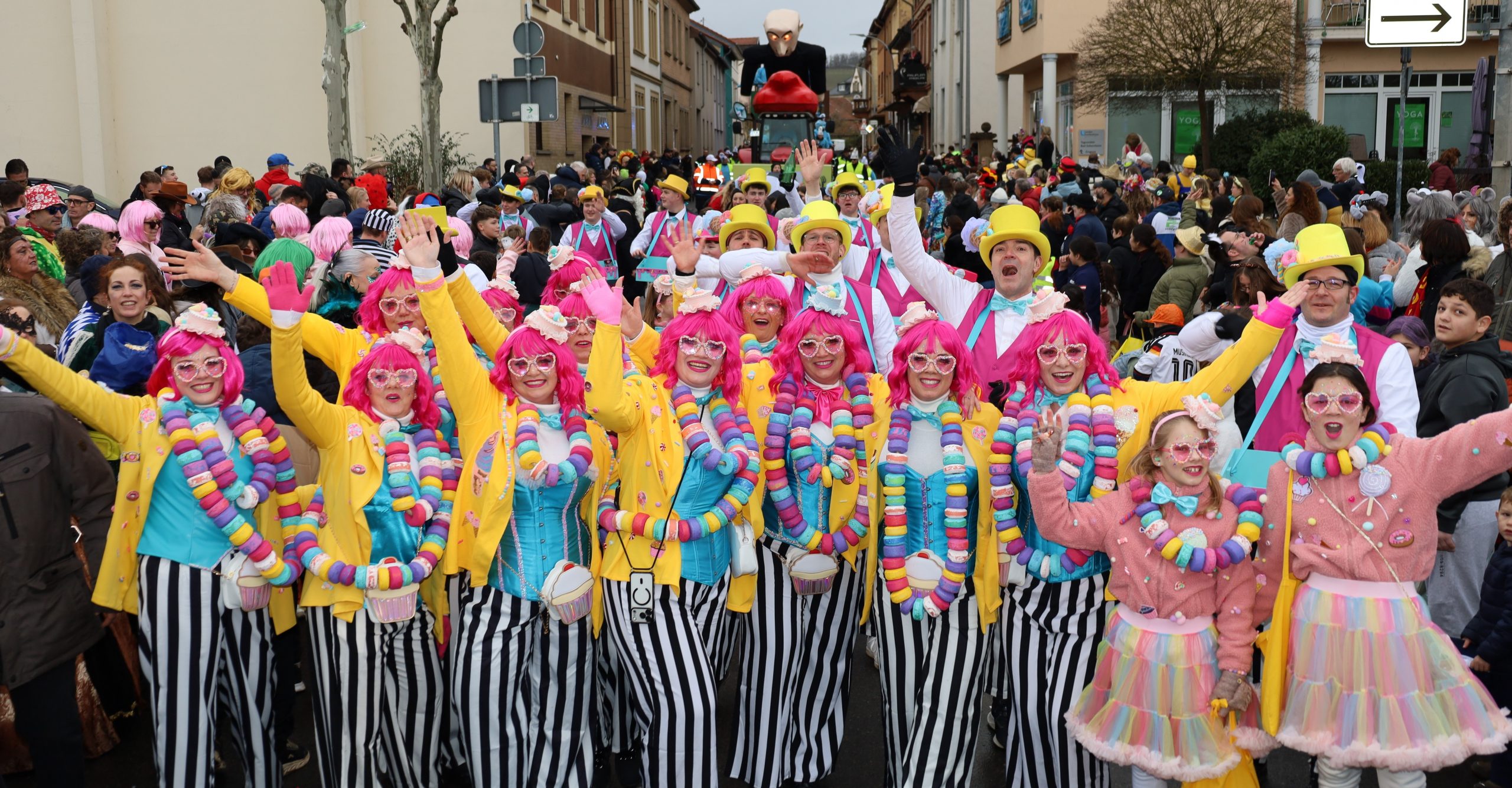 oben: Merxheimer Zauberwürfler. Merxheim. Dank Wetterglück bejubelten Tausende den farbenfrohen Lindwurm, der mit reichlich Verspätung startete. „Hinter uns liegt ein super-Jubiläumsjahr `3×11…
