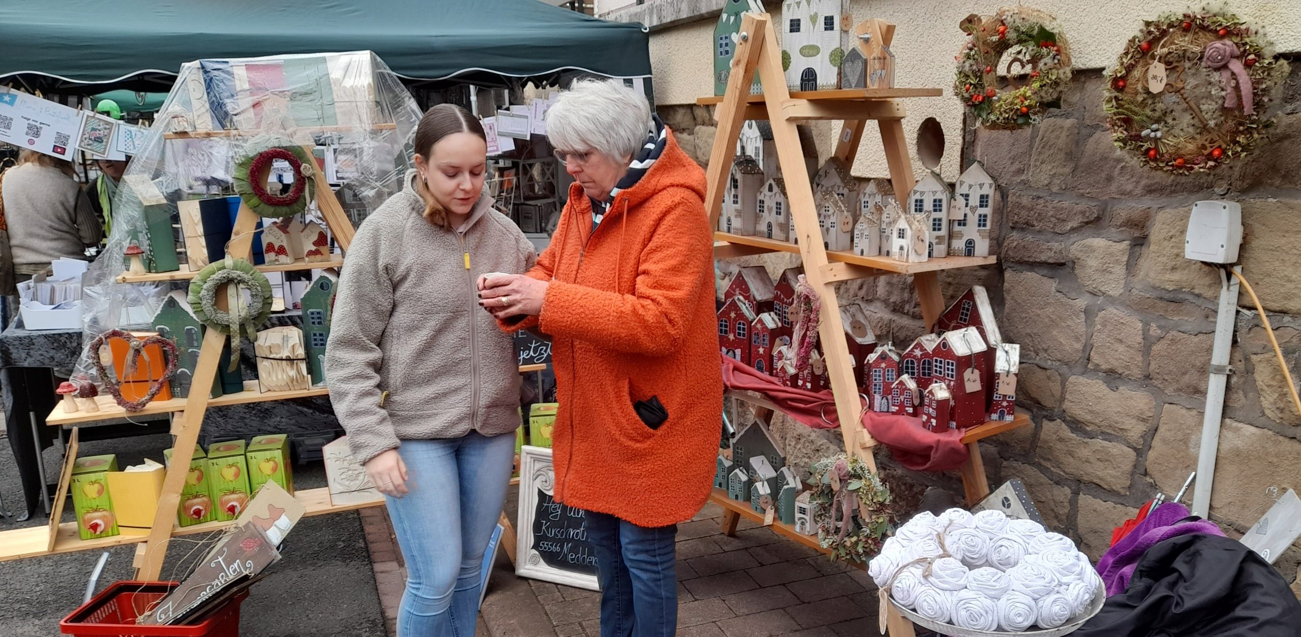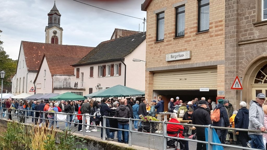 In Schweinschied luden über 80 Stände mit Kunst-, Handwerks- und regionalen Produkten ein – gleich drei sogenannte „Gulaschkanonen“ bereiteten Kartoffelsupp mit Einlage oder gefüllte Kartoffelklöse mit Specksoße und dem Caterer Alexander Schätzel an, das „Epizentrum“ war quasi an der Bäckerei Röder/Bleisinger, wo die einladend-herbstlich gedeckten Tische proppenvoll besetzt waren. Neben einem tollen Kuchenbuffet durfte die Ordtimer- und Traktorausstellung nicht fehlen. Schon ganz früh waren die vielen Helfer präsent; – mit dem Fahrrad erledigte Gerhard Fritz schon in aller Herrgottsfrüh eine logistische und routinierte Meisterleistung par Exzellent in der engen Hauptstraße bei der Standeinteilung und war an allen Ecken und Enden gleichzeitig.