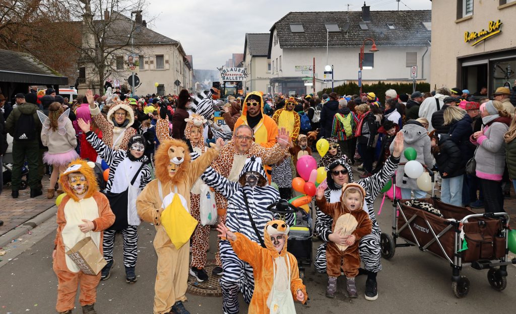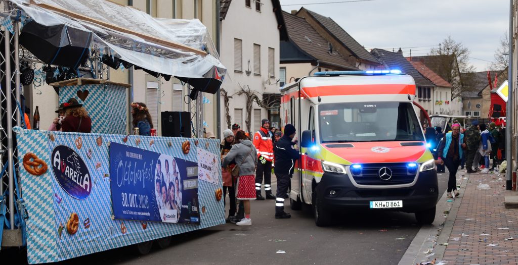 Alle Gruppen waren mit Elan und voller Begeisterung mit von der Partie, die größeren Wagen, etwa der Großen Merxheimer grün-gelben Garde, „Losse mol“ aus Staudernheim, das Blaue Ballett, die Flohhopser aus Seesbach oder die Nahe Tornados waren wunderschöne Eyecatcher, fantastisch und bombastisch; – die Wagenbauer scheuten weder Kosten noch Mühen. Und auch Wurfmaterial gab es reichlich, hinter dem Auto des Sowwerummer Förderverein Rosenmontagszug (FSR) war ein Anhänger und der war proppenvoll davon. Chronistenpflicht: Vor 16 Uhr war in der Hauptstraße/Naheweinstraße, am Denkmal, der DRK-Rettungsdienst bei zwei Einsätzen gefordert.