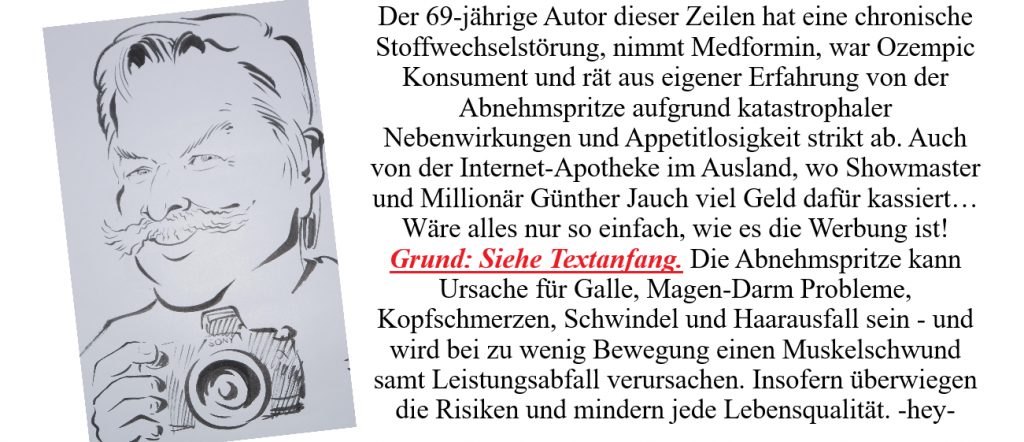 Die hochwirksame Ozempic® Abnehmspritze hat wie alle Arzneien krasse Nebenwirkungen. Die Spritze war monatelang 2024/ bis März 2025 in Apotheken an Nahe&Glan nicht verfügbar/Mangelware/ausverkauft. Das A&O ist allein die medizinische Notwendigkeit – ursprünglich für Menschen mit Typ-2-Diabetes entwickelt wird suggeriert, die Abnehmspritze sei so unkompliziert wie ein Hustendrops oder eine Lutschpastille und sei ein alltägliches Lifestyle-Medikament. Dem ist nicht so. Sie hat als Pendant rein gar nichts mit der Krankheit Magersucht gemein, auch der „Sex-and-the-City“ Vibe und Hype oder die neue „Body-Positivity-Story-2025“ laufe in die völlig falsche Richtung. www.Heylive.de rät grundsätzlich, die Beipackzettel und das kleingedruckte dreimal zu lesen und nicht zu ignorieren. Wie heißt es doch so schön: Bei Risiken und Nebenwirkungen… fragen sie ihren Arzt & Apotheker!