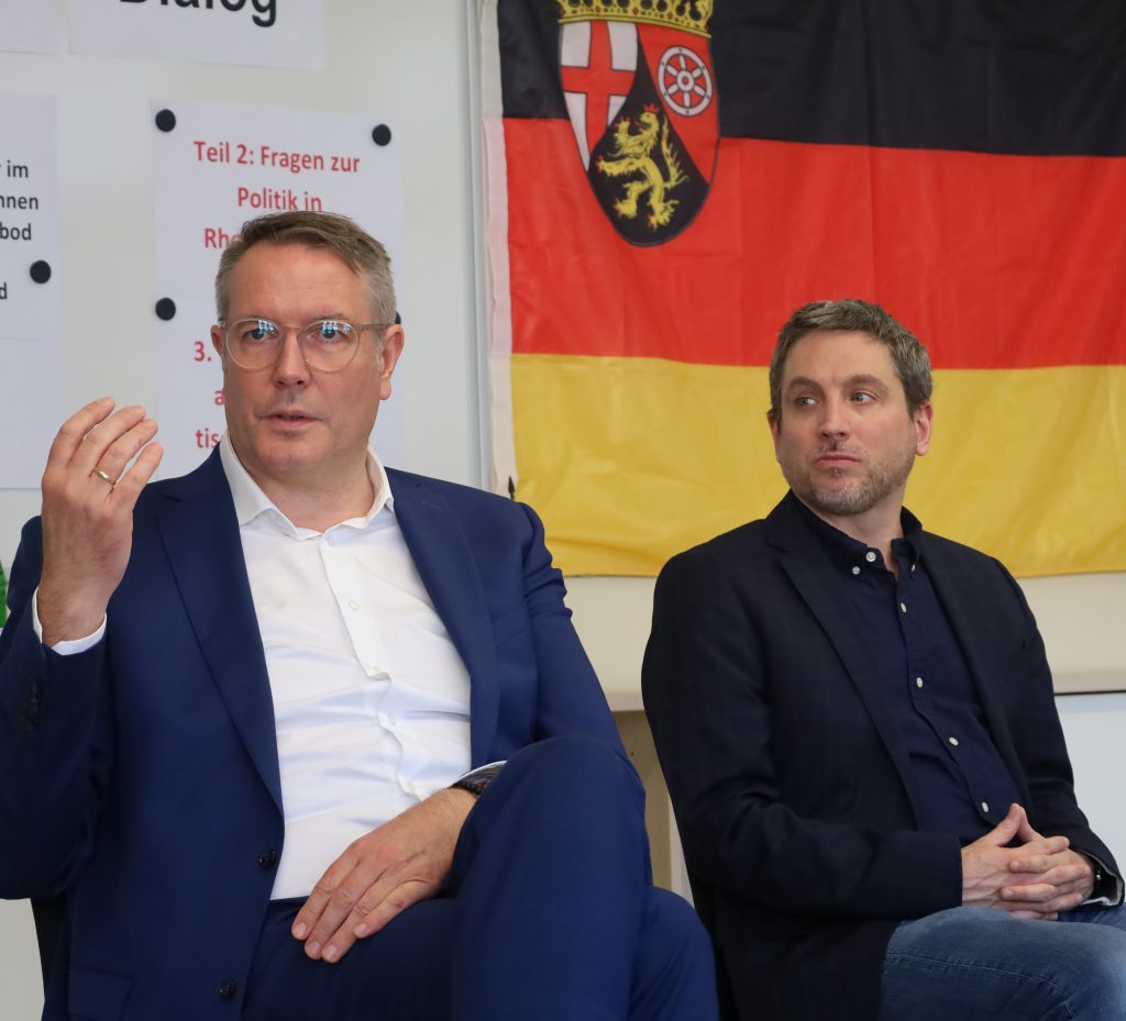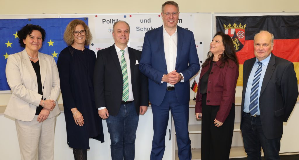 Foto Oben: Brigitte Sienz, die Didaktische Koordinatorin, Carina Möller von der ADD Koblenz, Konrektor Markus Kuproth, Alexander Schweitzer, Rektorin Katja Hahn und der pädagogische Koordinator Jochen Greif beim Erinnerungsfoto. „Wie hält man es als Pfälzer FCK-Fan in Mainz aus?“, neckte Noah Schlarb. Er arbeite nur in Mainz – aber sei froh, dass die 05´er Erste Liga spielen, erklärte der „Landesvater“ diplomatisch. Bei der Juniorwahl an der Schule habe die AfD 21,9 Prozent erhalten. Jan Schröder und Florian Stasek hakten nach: Was kann die Politik tun, kann die AfD verboten werden? Klare Ansage: Die Väter des Grundgesetzes kamen aus einer Kriegs-Ära und waren mit den Folgen der NSDAP belastet; – „Rechtsradikalismus lässt mich nicht kalt – heute gibt es gute Gründe die AfD zu verbieten, weil sie die Demokratie zerstören will“.