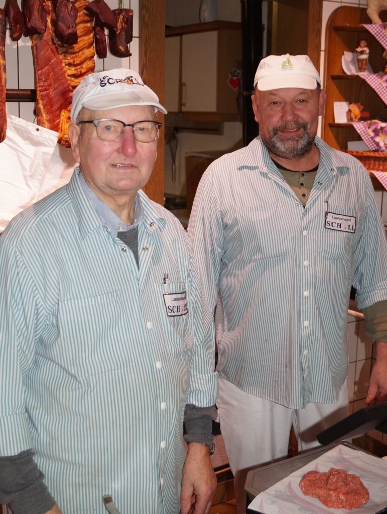 (Bockenauer Urgesteine.li. Bernhard, re. Sohn Thomas). Der Senior ist im August 1932 geboren, er absolvierte im Juli 1956 bei der Handwerkskammer in Frankfurt am Main seine Meisterprüfung. Sohn Thomas wurde 1960 geboren, in dem Jahr, als das Ehepaar Ilse und Bernhard Scholl in Bockenau, Im Striehl 1, den Schritt in die Selbstständigkeit wagten – auch er legte im Juni 1982 in Frankfurt im 241. Lehrgang bei der Fleischerschule Heyne seine Meisterprüfung mit Diplom ab.