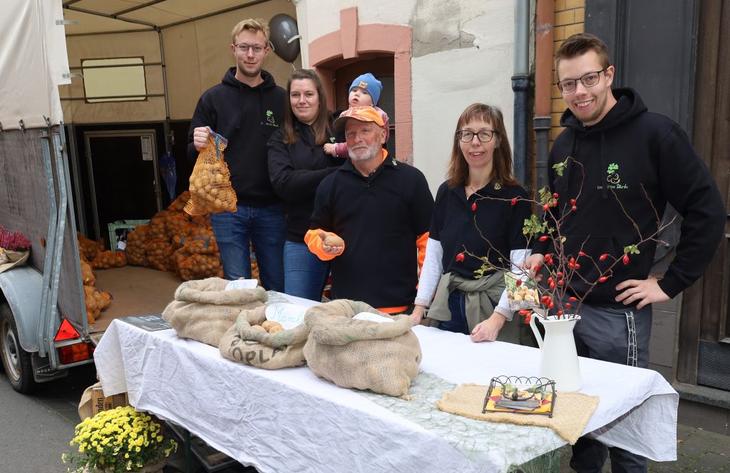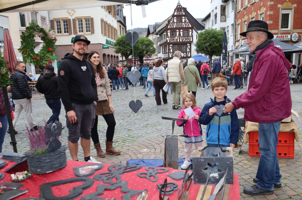 (Foto oben) Leo und Leni aus Simmertal durften sich ein Schiefer-Herz bei Dieter Weiland zurichten!Promotion-Stände und 60 Händler boten alles Mögliche in Hülle und Fülle. In der Gerbergasse stand der Kartoffelhof Kistner aus Merxheim und bot fünf Sorten Kartoffeln an, Belana, Marabel und Lilly hießen die Renner der tollen Knolle.