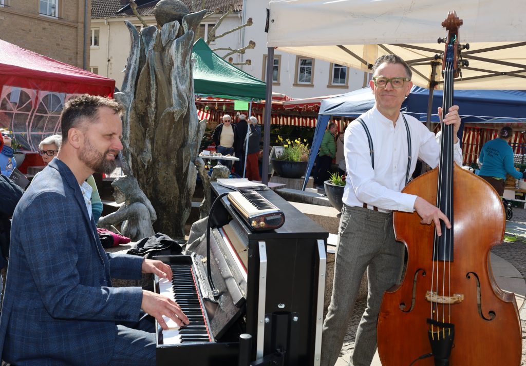 Hasen von der lila Kuh im österlichen Geschenk-Set sponserte der Rewe-Markt von So-Aktuell Mitglied Lena Isenbruck, Eisgutscheine Sevda Ocak vom Eiscafe` La Gondola und das Blumenhaus am Markt von Sigrid Langer spendete Keramikfiguren. Über 300 gefärbte Eier lieferte Daniel Elsner vom Geflügelhof aus Seibersbach. Er zählt mit den Wochenmarktständen donnerstags ebenso wie der 12 Meter lange Fruchthof Frorath aus Mainz Finthen, der Fischshop, der Weinstand Q17.10 oder die Eisdiele zum festen Inventar –„ja, wir wollen nicht klagen und werden sehr gut frequentiert“, sagte Elsner. Das Märkteteam-Quartett der felkestädtischen Kaufmannschaft mit Ully Mathias, Beate Fritz-Schmell, Stefan Klußmeier und Kai Sommer hatte den Hut auf und betrieb einen Stand vis-a-vis der Schatzkammer. Zur Freude von Groß und Klein schlüpfte Zeynep Durna vom Meisenheimer Paul-Schneider Gymnasium (PSG) ins Osterhasenkostüm und verteilte mit Lucie Mathias und Samira Mack bunte Ostereier, die Kids ließen sich gerne ablichten. Weitere Schüler des PSG betrieben einen Stand für die Abifeier 2028. Für die musikalische Umrahmung sorgte die Odernheimer Walk-Act-Band „Buskers De Luxe“. Als der Drehorgelspieler Bernd Fewinger für wohltätige Zwecke das Lied „..klingeling hier kommt der Eiermann“ spielte, öffnen die Besucher das Portemonnaie. Alles passte am Gründonnerstag.