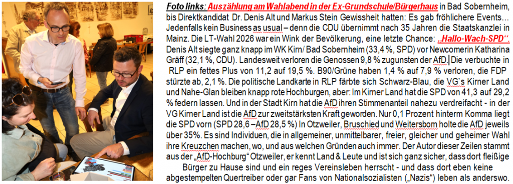 Gretchenfrage: Ist aufgrund des spezifischen Wahlergebnisses die Schieflage im himmelblauen Kirner Land bezeichnend, und/oder warum ist das so, wenn ein „Geschmäckle“ das andere ablöst? Und was, wenn die AfD-Fraktion mit sechs Sitzen im VG-Rat Kirner Land einen tollen Job erledigt, den die Bürger mittragen? Wird die AfD nicht auch von der CDU im EU-Parlament gebraucht und hofiert? Es empfiehlt sich für jeden Staatsbürger, Ratssitzungen zu besuchen und sich selbst ein eigenes Bild zu machen. In Kirner Ratsstuben ist jedenfalls bis dato von Hass und Hetze seitens der AfD wenig zu spüren – auch Neofaschismus steht nicht auf der Agenda.