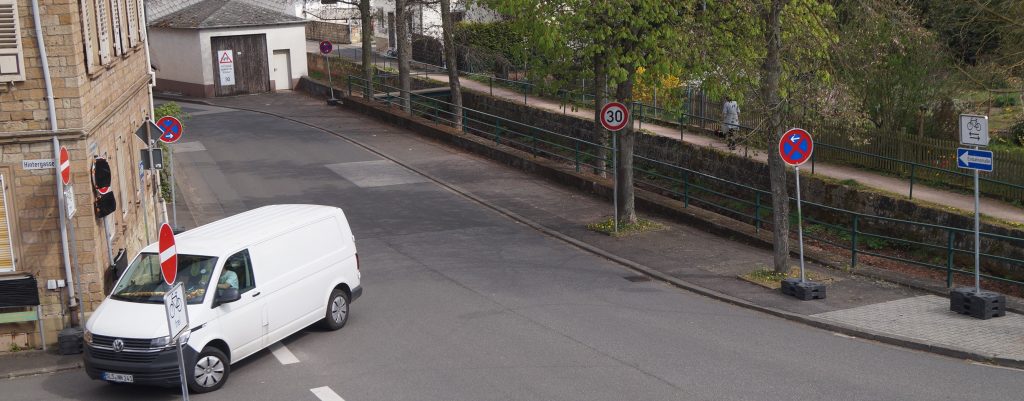Der VW oben kommt in Meddersheim entgegengesetzt der Einbahnstraße und fährt in eine gesperrte Straße. Sachen gibts, geht`s noch!? Wenn nicht kontrolliert und vor Rasern&Rowdies in den Sozialen Medien und Apps noch gewarnt wird, dann weiß auch www.Heylive.de nicht weiter. Tempo30 Schilder jedenfalls sind für alle Beteiligten so unsinnig-kontraproduktiv und paradox wie ein Holzprotokoll, oder wenn man einem „Ochs` ins Hoore petzt“.