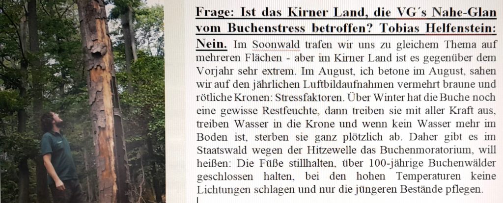 Fotos oben: specialprint Michael Müller, Kirn. Kirn./VG-Kirner Land. Ob in Print-Ausgaben, den sozialen Medien, in Schulen, bei Veranstaltungen oder in den Orten im Forstamt Bad Sobernheim, wo der Förster für die Waldwirtschaft verantwortlich zeichnet: Der 33-jährige Forstbeamte Tobias Helfenstein ist omnipräsent und will im Kirner Land VG-Bürgermeister werden und „das Kirner Land voranbringen“ ist klare Ansage. Auch wenn von allen Seiten alles gesagt ist: www.heylive.de will den eloquenten Bewerber, der sachlich-fachlich versiert ein gutes Bild abgibt und dem Verwaltungserfahrung nachgesagt wird, vorstellen. Der Forstoberinspektor, Jahrgang 1992, gebürtiger Kirner mit fundierter Ausbildung und Coach junger Forstkräfte, leitet seit 2021 im Forstamt Bad Sobernheim das Forstrevier Kirn mit 2.600 Hektar und der reduzierten Holzfläche von 1.600 Hektar als Revierleiter-Nachfolger von Katharina Rohde. Durch seine Arbeit kenne er die Bedürfnisse und Herausforderungen von Land & Leuten und den Alltag in den Dörfern: „Mir ist wichtig zuzuhören, zu verstehen und dann Lösungen zu finden, die wirklich wirken“, sagte er auf www.heylive.de Nachfrage.