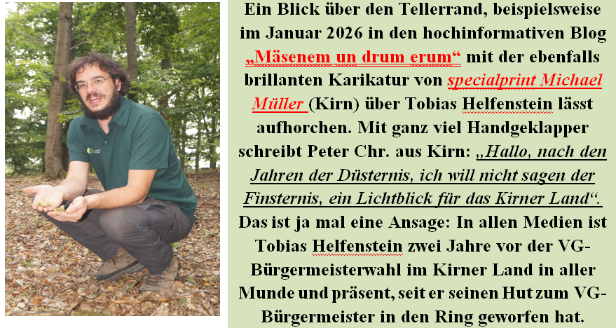 Helfenstein hat Mut, der Förster sorgt in einer schwierigen Gemengelage entschlossen für klare Kante. Er will Verantwortung übernehmen, kennt Förderprogramme und Fördermittelgeber. Das Kirner Land und die Stadt Kirn schiebt nach der Fusion einen Sanierungsstaus vor sich her. Nicht zuletzt weil Fachkräfte abwanderten, ist das ein Dilemma. Der am 9. Januar 2020 vereidigte Amtsinhaber aus Oberhausen bei Kirn hat sich mittlerweile für die CDU entschieden, was ihm offensichtlich nicht zum Vorteil gereicht. „Ohne Schwung –Thomas Jung“ witzelt die Opposition und selbst seine eigene „Hausmacht“, die CDU und die FDP haben sich jüngst gegen ihn bei der Stellenbesetzung Bauamt/Sozialamt, positioniert, die AfD auch. Dem Wähler fehlt Transparenz – über was und wo wird da geredet? 2026 ging jetzt der VG-Wehrleiter von der Fahne. Gerade in Kirn und im Kirner Land fehlen Koryphäen – „Platzhalter“, die mit Transparenz, stoischer Gelassenheit und Aufrichtigkeit die Bürger mitnehmen. Die FDP fordert eine Bestandserhebung, „Stillstand sei Rückschritt“.