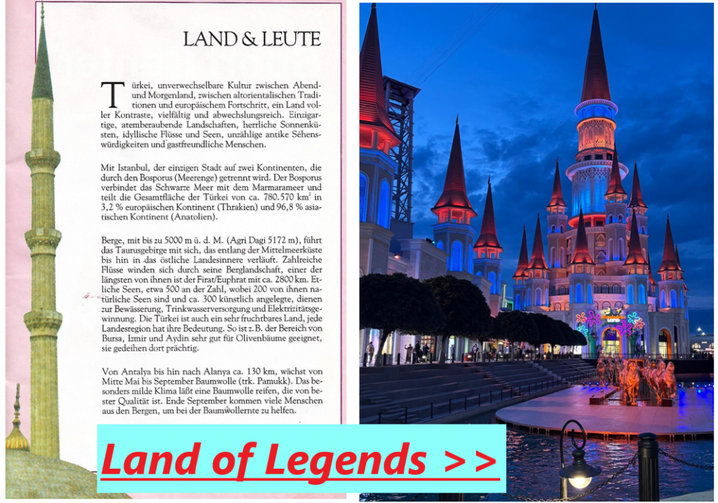Seit jeher ist die Türkei zwischen Orient und Okzident eine Reise wert – morgens Skifahren im westlichen Taurusgebirge nördlich von Antalya oder der Top-Urlaubsregion Belek mit der atemberaubenden Disneywelt „Land of Legends“ und nachmittags am Strand Sonne baden ist Faszination pur. Ältere Türken sind traditionell D sehr verbunden, ihre Zuneigung reicht bis zur Waffenbrüderschaft im Ersten Weltkrieg. Überall sind die Spuren der Weltausstellung EXPO 2016 (Slogan: „Blumen und Kinder“) in Antalya mit dem Aussichtsturm sichtbar. 10 Millionen Besucher wurden erwartet, weniger als 1 Million Gäste kam – 3 Milliarden Euro Miese standen zu Buche. Jetzt soll genau hier eine Weltklimakonferenz stattfinden.