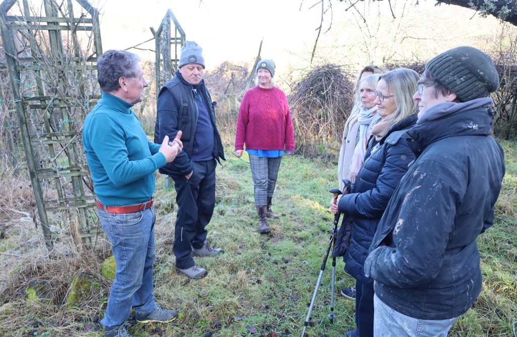 FOTO oben: Claudia Rhein (mitte) stellt der Achtsamland-Community den laufenden Plan B auf ihrem Anwesen auf dem Welschrötherhof vor. Die in Ludwigshafen gebürtige Claudia Rhein kennt man in Löllbach als jahrzehntelange Betreiberin des alten Ziegenhofes. Sie ist Initiatorin des Netzwerkes „Achtsamland“ und des gemeinnützigen Vereins „Lebe Einfach e.V.“ Vor gut zwei Jahren kaufte Claudia Rhein das 1953 erbaute Anwesen auf dem Welschrötherhof. Hier sollte das erste große ökologische Bildungsprojekt unter dem Überbegriff „Öko 3 Lebenswelt Nahe-Glan“ entstehen, wobei die Zahl 3 für den Gleichklang Ökologie, Ökonomie und Bildung steht. Ziel des Vorhabens unter dem Slogan „ Lebenswurzeln – Kelten & Hildegard als lebendiger Kulturraum“ ist es, die Entwicklung des Welschrötherhofs zu einem dauerhaft nutzbaren, öffentlich-zugänglichen Kultur-, Lern- und Erlebnisort in der LEADER-Region Soonwald-Nahe zu forcieren. Damit verbindet das Projekt quasi zwei bedeutende, regionale Wissens- und Kulturtraditionen eines naturverbundenen Welt- und Pflanzenwissen der Kelten sowie die Lebenslehre und das Heilwissen der Heiligen Hildegard von Bingen.