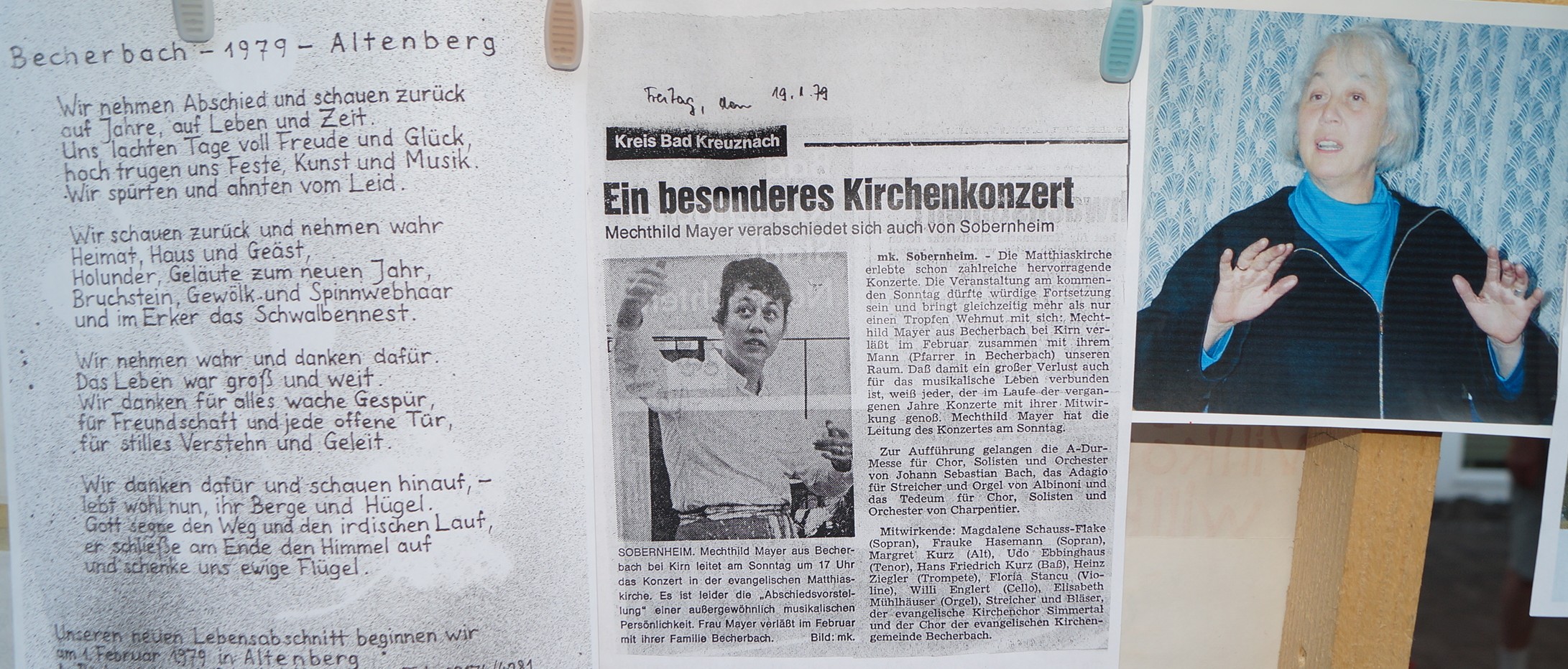 Mechthild Mayer wird nach 57 Jahren am zweiten Weihnachtsfeiertag 2025 in der Becherbacher Kirche letztmalig den ev.Chor der Kirchengemeinde Becherbach leiten, ihr Mann Friedrich, Pfr.i.R. hält den Gottesdienst. www.heylive.de berichtet noch. Neben diesem Chor gründete Mechthild Mayer 1982 den Becherbacher Brückenchor und 1971 zur Einweihung des Dorfgemeinschaftshauses den Frauenchor Otzweiler, der nach fast 50 Jahren leider verstummte. (Foto unten)
