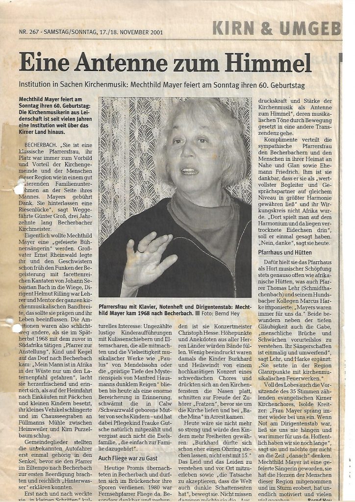 …ob als freischaffender Journalist bei der Kirner Zeitung seit 1976!, ob als „Freund und treuer Wegbegleiter“, wie Mechthild Mayer selbst den Autor dieser Zeilen im September 2025 erwähnte, ob als Kirchen- oder Konzertbesucher oder als Mitwirkender zweier grandioser, unvergesslicher und menschlich prägender theatralischer Aufführungen. Da ist die einstudierte Legende von Selma Lagerlöf „Vom Mann der Feuer holen ging“ in der evangelischen Kirche an Heiligabend in Becherbach und in Meddersheim zu nennen. Desweiteren wurde das über dreistündige Mysterienspiel von Manfred Hausmann „DER DUNKLE REIGEN“ akribisch und professionell bis ins kleinste Detail einstudiert und in vielen hiesigen Kirchen und Städten bis ins Rheinland nach Bonn und Düsseldorf aufgeführt. Dieses geniale Spiel –beispielsweise- weckte nachdenklich-machendes Kopfkino und sollte für alle 14 Hauptdarsteller und den großen Anhang der Kirchengemeinde samt Zuschauer bis heute unvergesslich und prägend sein. „Es ist ein Gedankenstück mit Stellen von überirdischer Schönheit. Ein Spiel, in dem Zwölf heimgeholt werden. Tod und Leben streiten sich, wer der Mächtigere sei“, schrieb das Wiesbadener Tageblatt treffend. „Das Mysterienspiel…hat den Samtschimmer einer lyrischen Sonate, in die Sprache und Bild, Reim und melodischer Laut voll sanften Wohlklangs eingefügt sind“ (Rheinischer Merkur, Koblenz)